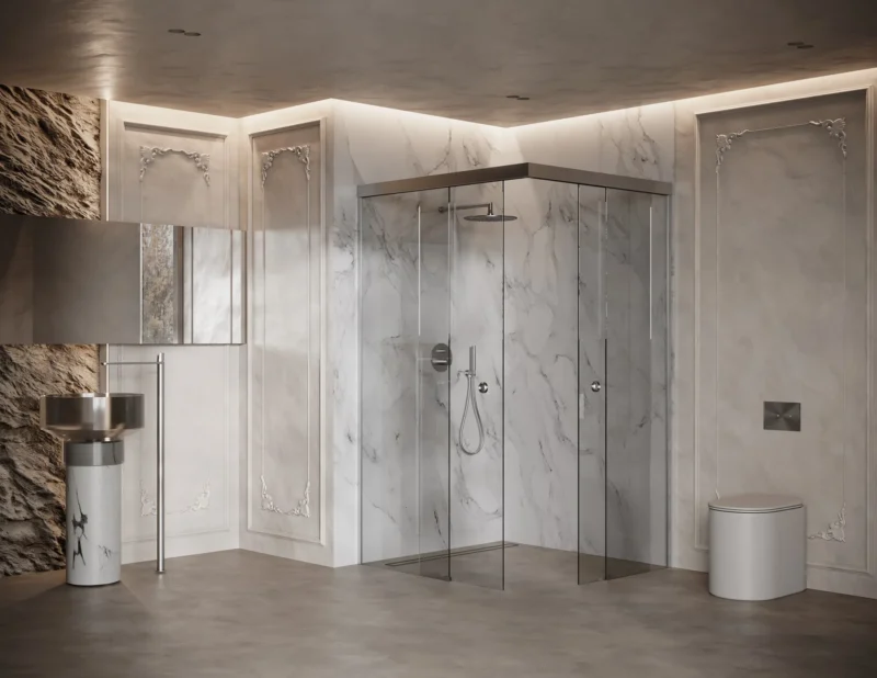 - Flexible Montagemöglichkeiten: MALAGA MAX bietet vielfältige Installationsvarianten – sei es an der Wand, an der Decke oder als nicht raumhohe Lösung. Ob Eck-, Einzel- oder Doppelkabine, die Anpassungsfähigkeit der MALAGA MAX erlaubt eine perfekte Integration in jedes Badezimmerdesign.