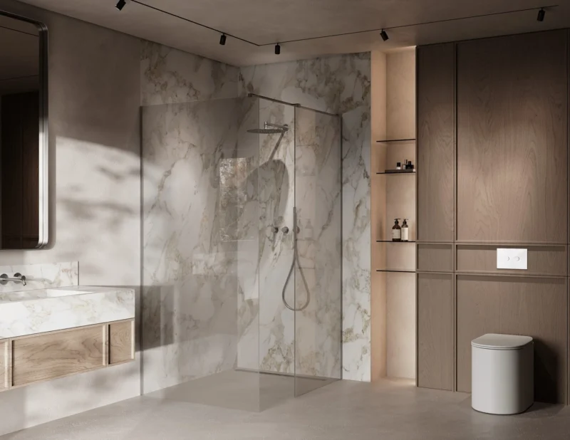 - Wasserdichte Abdichtung: Die Verbindung zwischen Glaswand und Boden wird präzise mit transparentem Silikon ausgefüllt, um einen wasserdichten Abschluss zu gewährleisten und die Reinigung zu erleichtern.