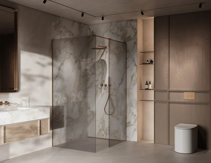 - Flexible Montageoptionen: Abhängig von der gewählten Maßvariante können die Glaswände entweder mit einem „U“-Profil oder mit eleganten Messingklammern an den Wänden befestigt werden. Diese Optionen ermöglichen eine individuelle Anpassung an das Design und die Anforderungen Ihres Badezimmers.