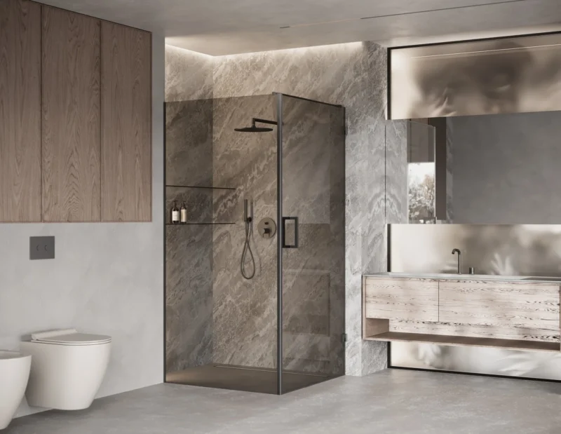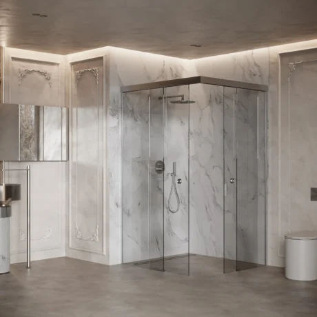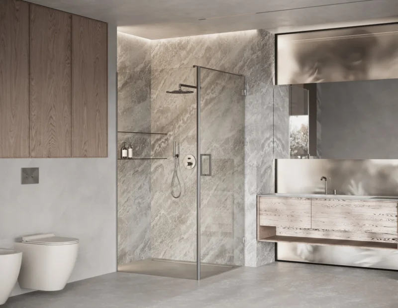 Die Installation der OLAF-Kabine ist sowohl auf einer Duschwanne als auch direkt auf dem Boden möglich, was Universalität und Anpassungsfähigkeit an jedes Badezimmer gewährleistet. Klarer Silikon zwischen Boden und Glas oder die Option der Montage in einem „U“-Profil an der Wand sind nur einige der verfügbaren Optionen, die ihren modernen Charakter unterstreichen.