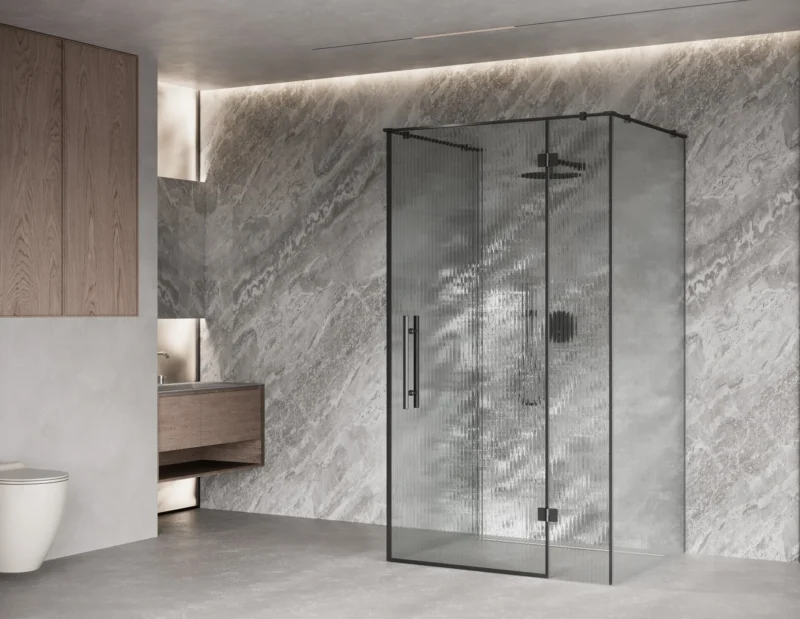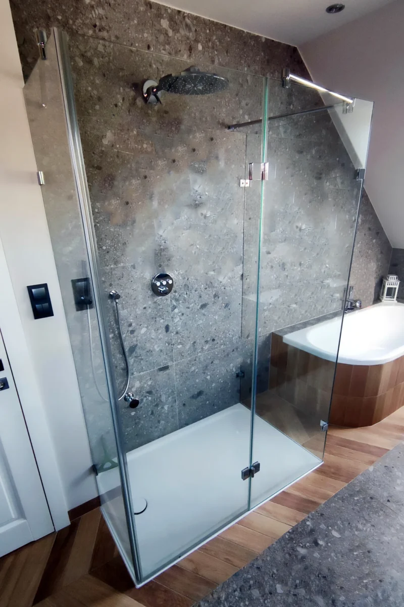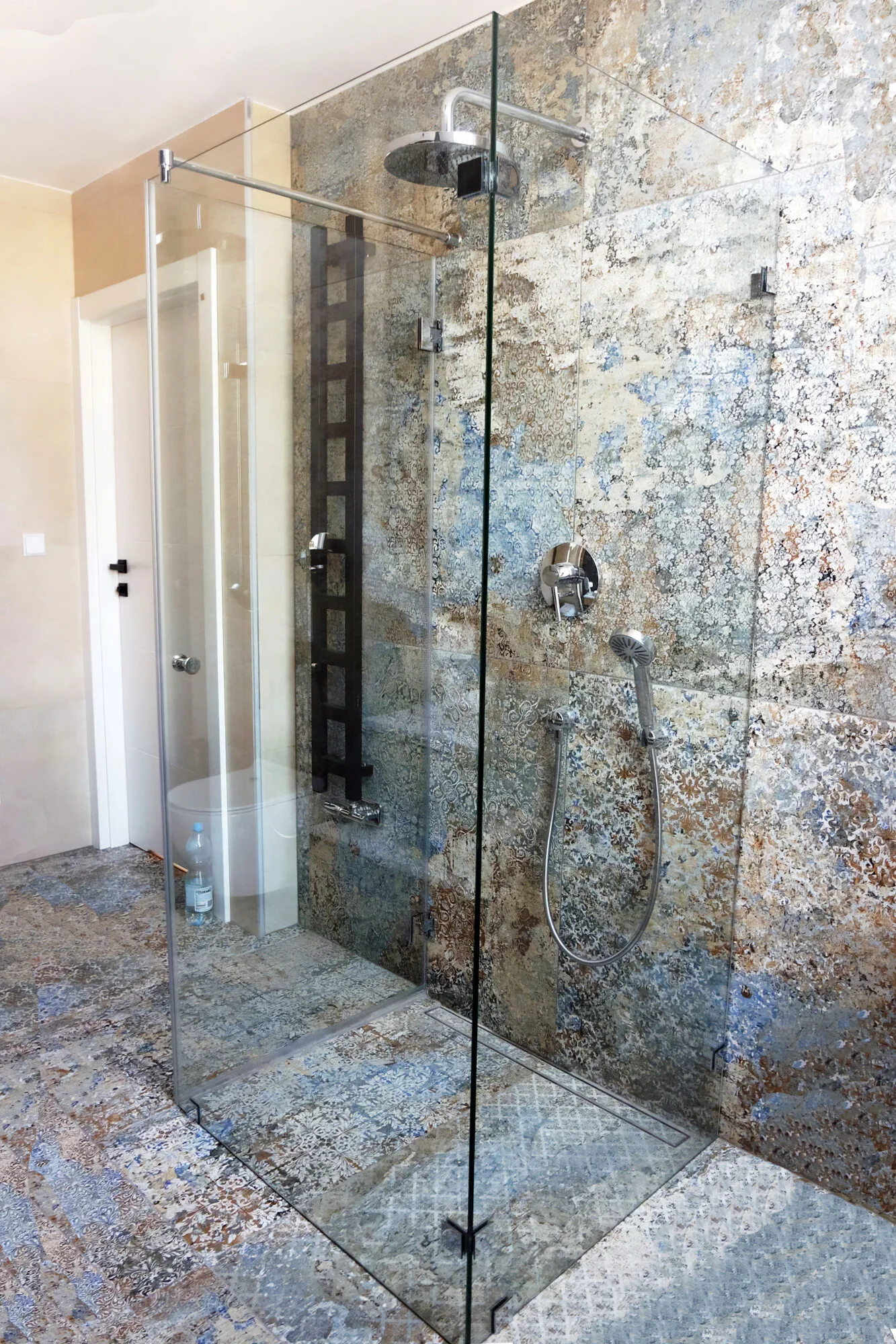 - Wasserdichte Lösung: Die Verbindung zwischen Boden und Glas ist sorgfältig mit transparentem Silikon abgedichtet, um Wasseraustritt zu verhindern und die Reinigung zu erleichtern. Alternativ bietet NOVEA die Möglichkeit, das Glas im „U“-Profil zu montieren, für eine noch individuellere Anpassung.