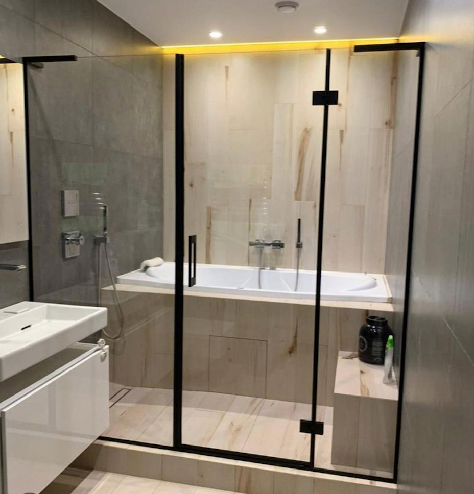 Mattierter Sichtschutzstreifen in der Mitte, der die wichtigsten Körperstellen abdeckt, oder über die gesamte Länge und Breite des Glases. Dadurch wird das Glas teilweise undurchsichtig, lässt aber Licht durch. Beim Aufmaßservice können Sie wählen, welche Variante zu Ihnen passt.
