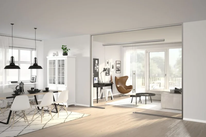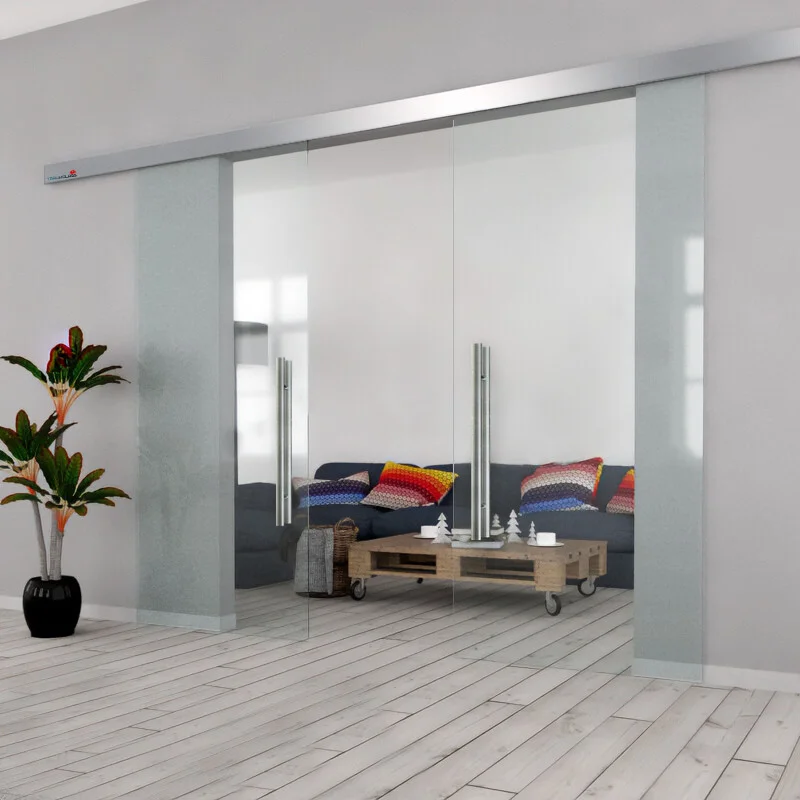 - Doppeltürsystem: Das System unterstützt maximale Türbreiten von 2 x 1000 mm, ideal für breite Durchgangsöffnungen und um Licht und Raum optimal zu nutzen.