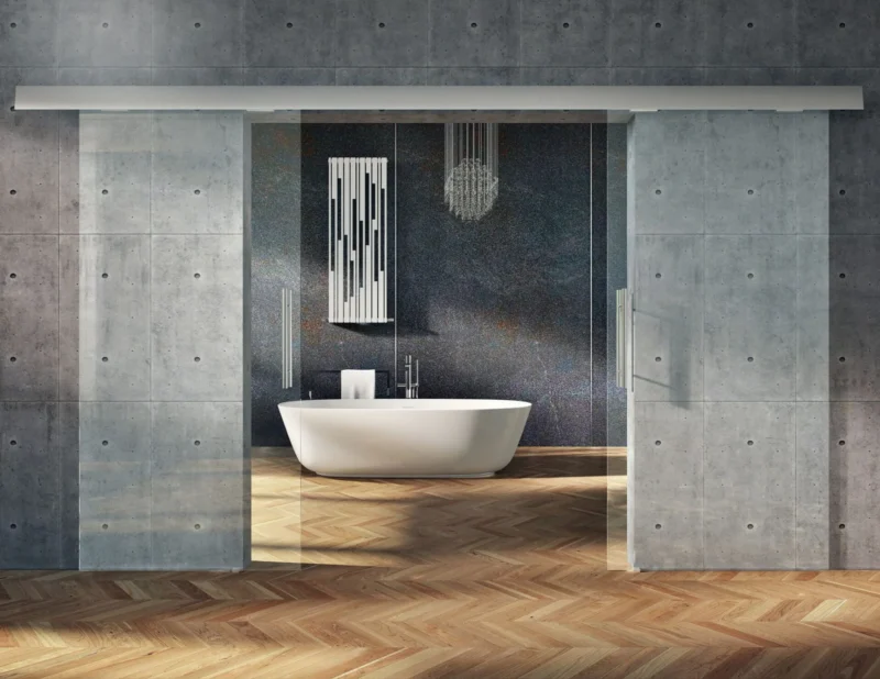 - Minimalistische Installation: Die Schiebetür in Kassette bietet eine verdeckte und saubere Montage mit einem Schienenquerschnitt von 5×5 cm.