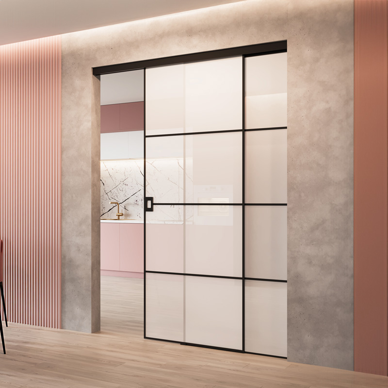 - Schiebetüre In Kassette: Eine minimalistische Installationsmethode mit einem 5×5 cm Schienenquerschnitt. Das Laufsystem ist verdeckt und verfügt über ein spezielles Softclose-System.