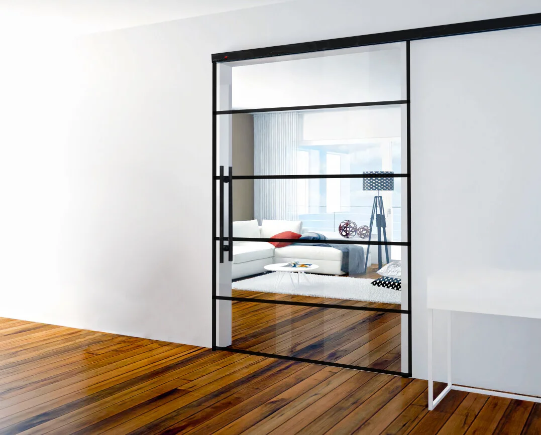 - Maßgefertigte Lösung: Die Glasschiebetür MONACO wird individuell nach Maß gefertigt und kann sowohl an der Wand als auch an der Decke befestigt werden, um Ihren Raum optimal zu nutzen.