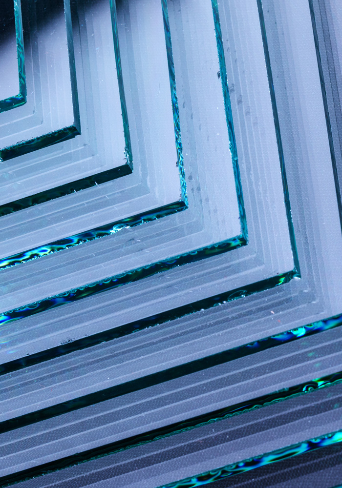 Sicherheitsglas besteht aus zwei, drei oder mehr Glasschichten, zwischen denen eine oder mehrere EVA- oder PVB-Folien eingelegt sind. Die Filme können farblos, milchig oder manchmal farbig sein. Es besteht auch die Möglichkeit, zwischen Glasscheiben, grafischen Elementen, Stoffen, Furnieren, Dekorfolien, Drucken usw. zu laminieren. Dank der Verwendung von Folie ist Verbundglas bruchsicher. Es bricht nicht in Stücke, da es an der Folie haften bleibt und eine gewisse Festigkeit behält, bis es ersetzt wird. Das Vorhandensein der Folie reduziert auch den Geräuschpegel, was Verbundglas zu einem sehr guten akustischen Isolator macht. Je nach Verwendungszweck kann ESG zur Erhöhung der mechanischen und thermischen Beständigkeit eingesetzt werden. Es ist auch möglich, eine Antirutschschicht auf der Oberseite von Verbundglas aufzubringen. Dies ist insbesondere bei Glasböden und -treppen von praktischer Bedeutung. Verbundglas wird sowohl innerhalb als auch außerhalb von Gebäuden verwendet. Es unterliegt allen Arten der Verarbeitung.